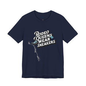 This T-Shirt features a fun and quirky design that says 'Rodeo Queens Wear Sneakers'. The vibe is casual and playful, perfect for those who appreciate unique and stylish fashion statements. Ideal for those who enjoy rodeos, country western culture, and anyone looking to add a touch of personality to their wardrobe. Perfect for casual outings, rodeo events, country music concerts, and everyday wear.
