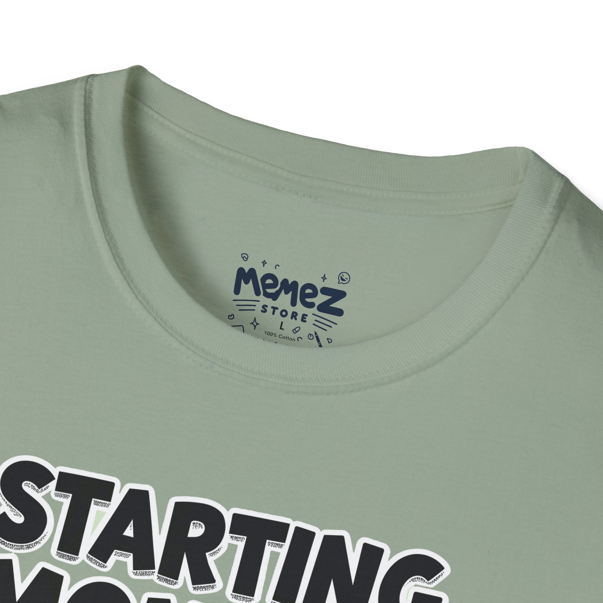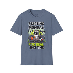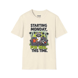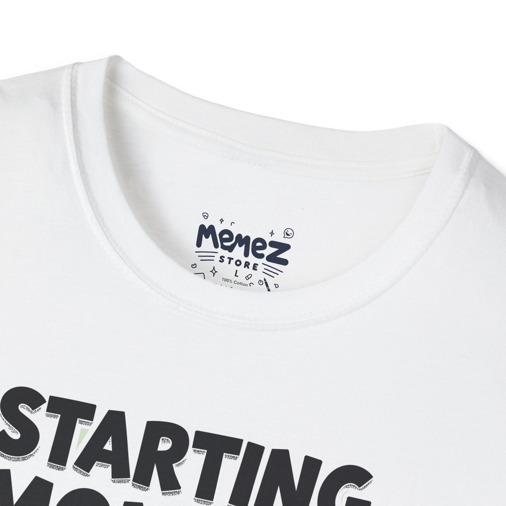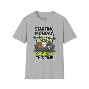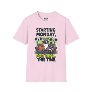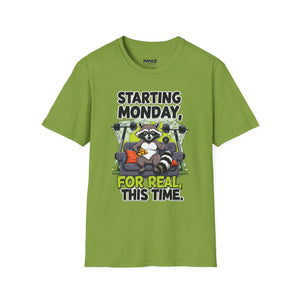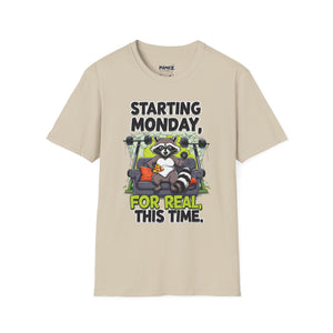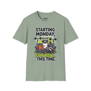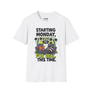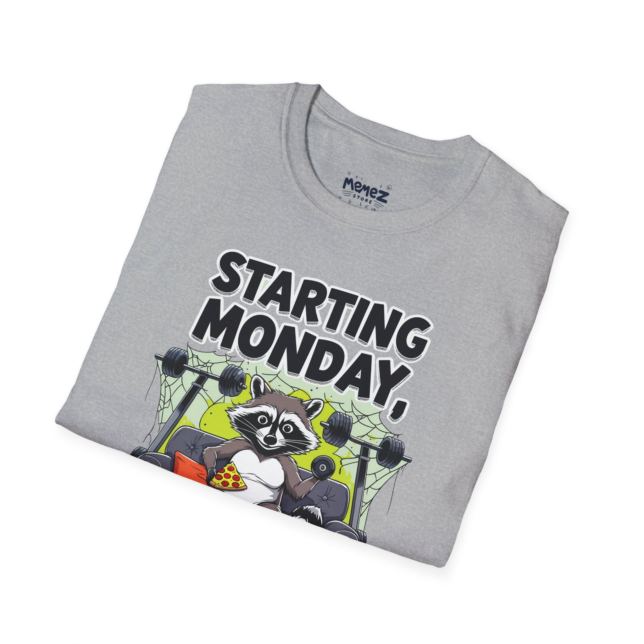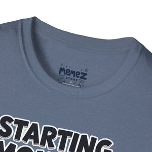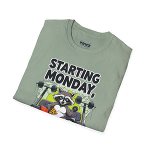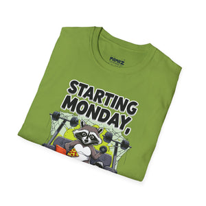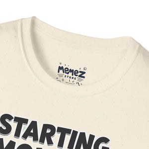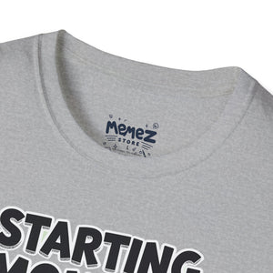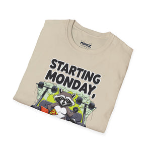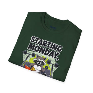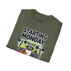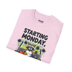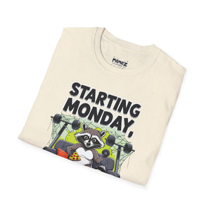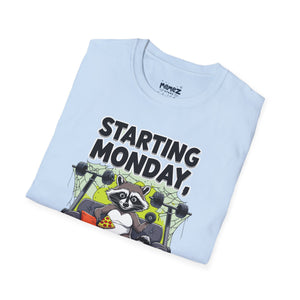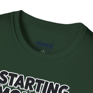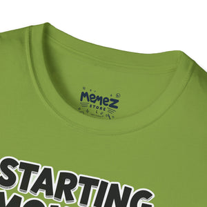 A funny and meme-inspired unisex T-Shirt perfect for casual wear, featuring the 'Starting Monday' design by Memez Store. The lightweight fabric and classic fit provide comfort and style for adults looking to add a touch of humor to their wardrobe. Ideal for those who enjoy meme culture and want to express their sense of humor through their clothing. Perfect for lounging or running errands, this tee is a great conversation starter.