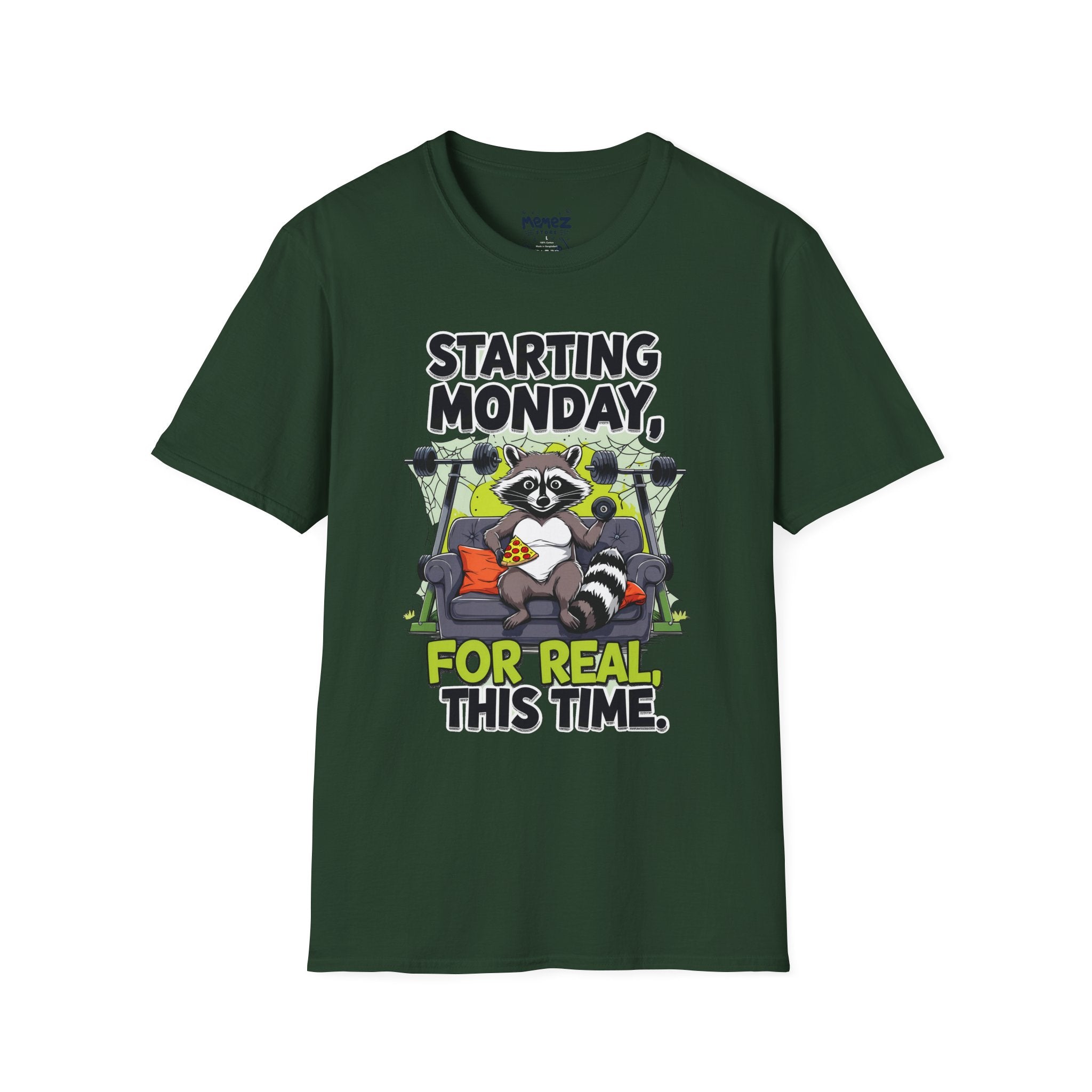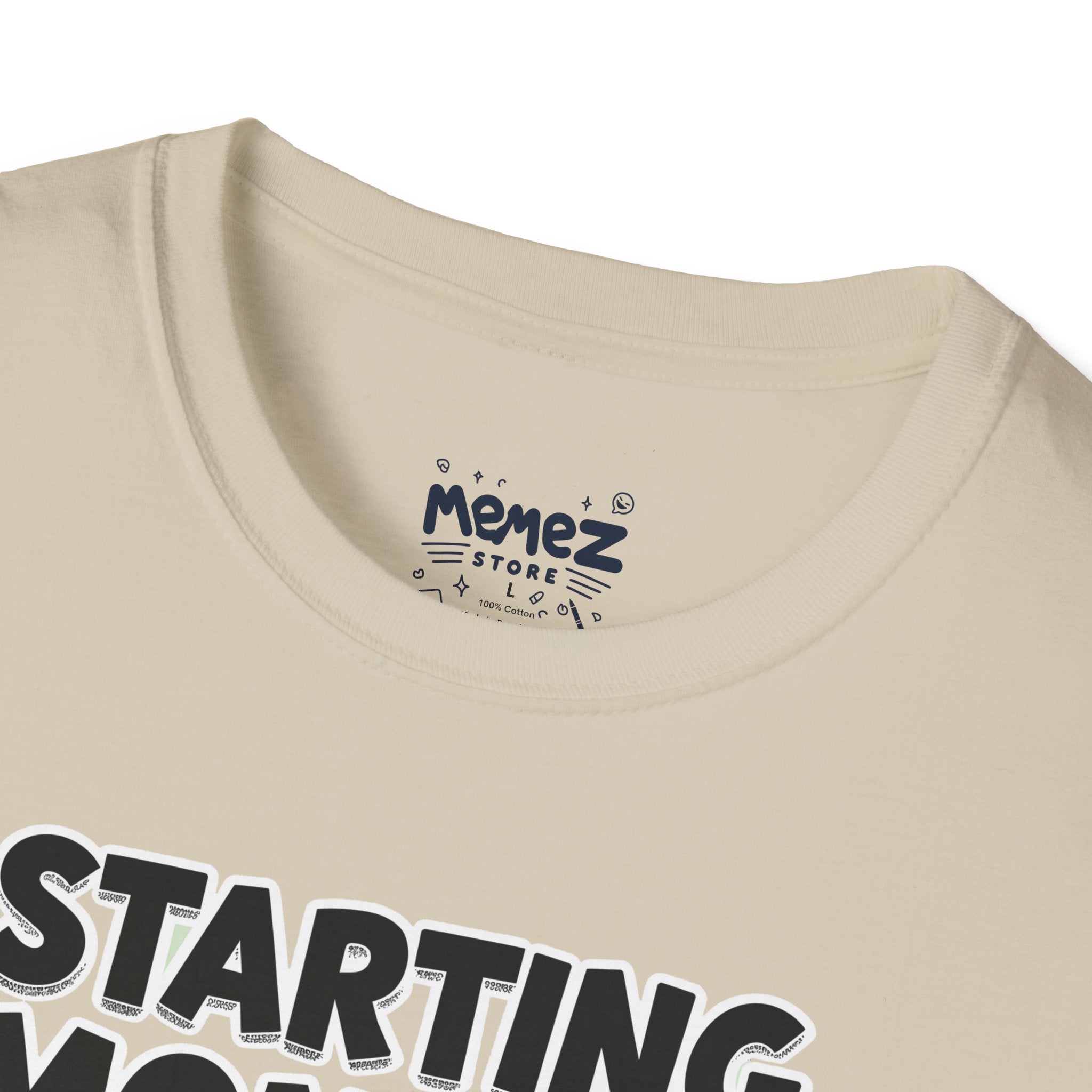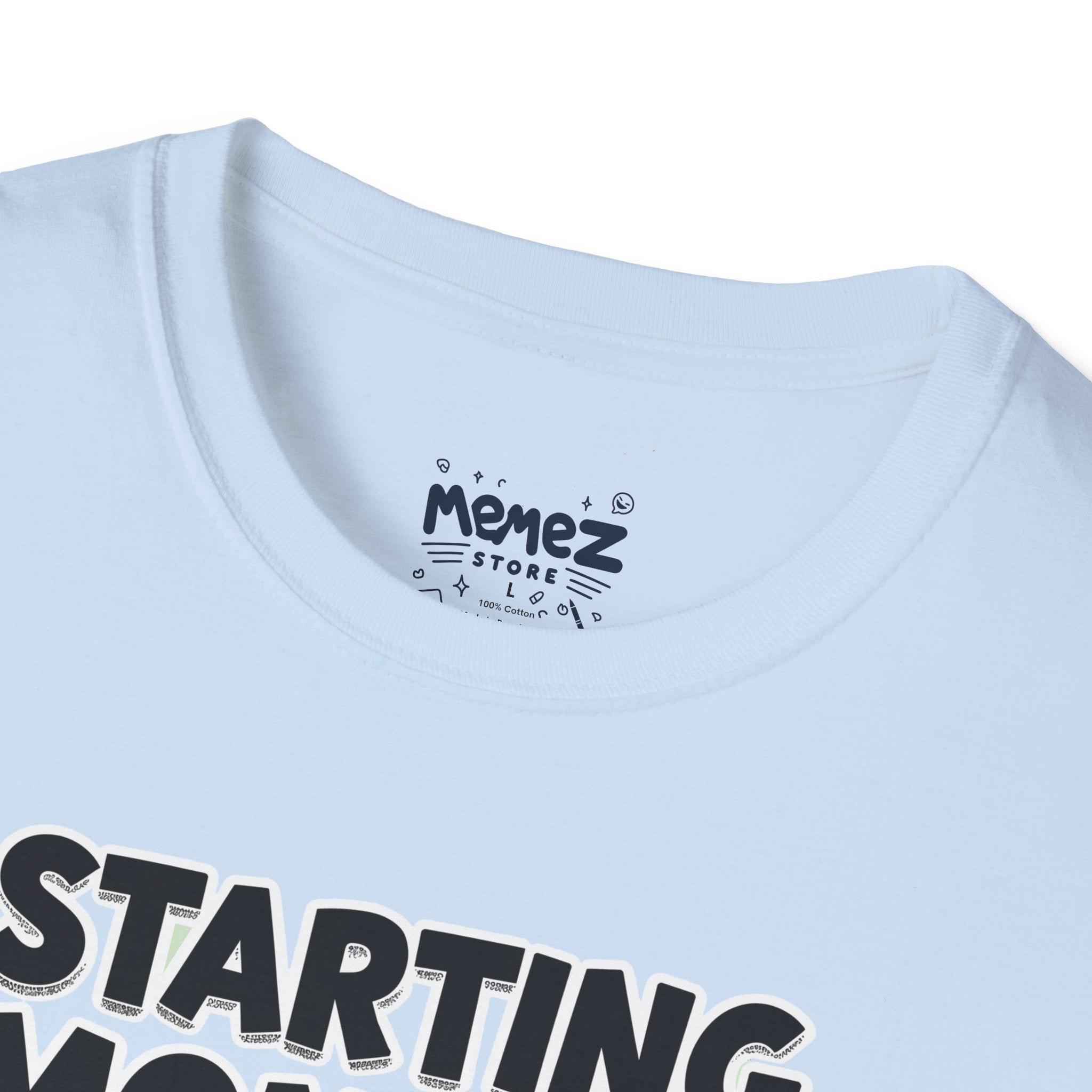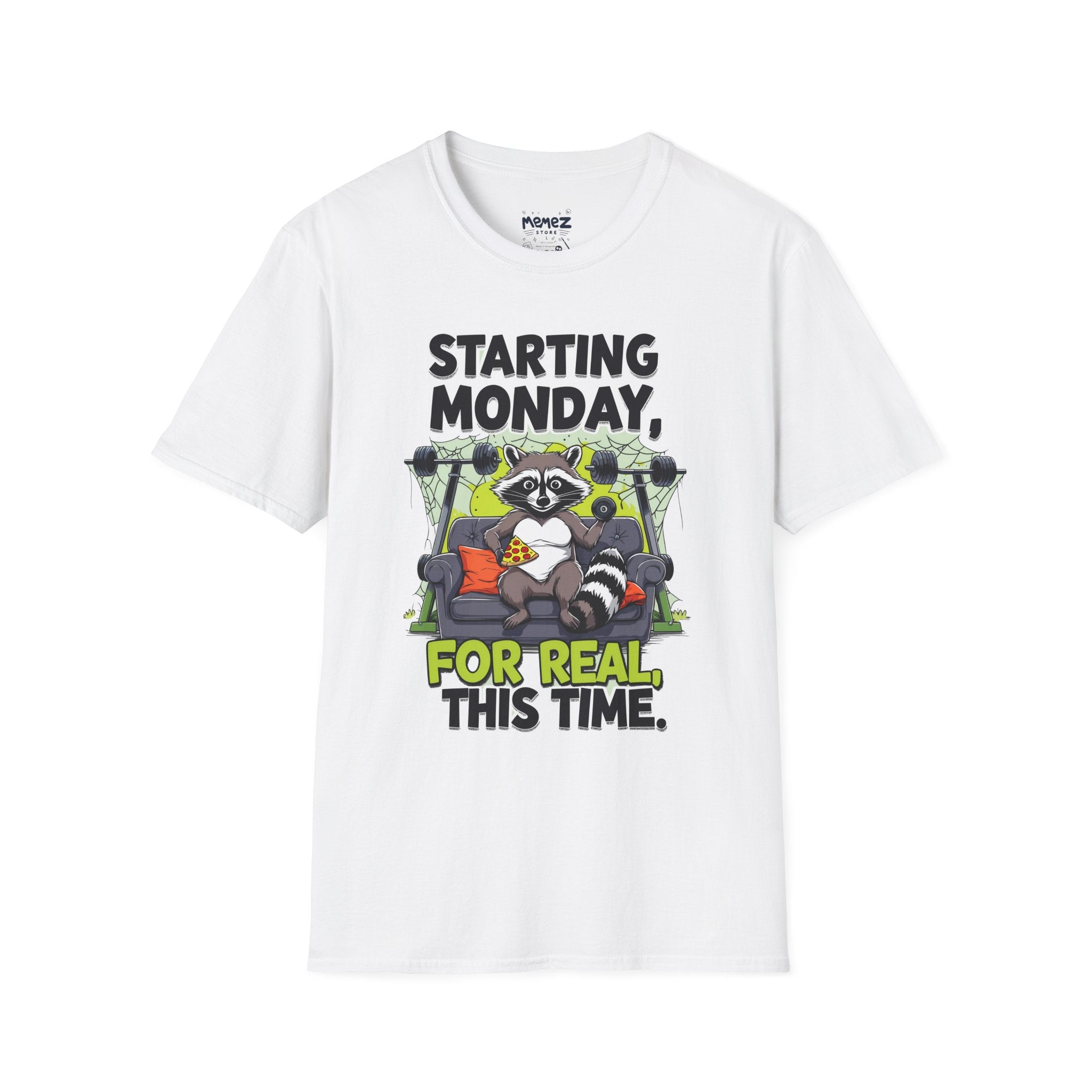 A funny and meme-inspired unisex T-Shirt perfect for casual wear, featuring the 'Starting Monday' design by Memez Store. The lightweight fabric and classic fit provide comfort and style for adults looking to add a touch of humor to their wardrobe. Ideal for those who enjoy meme culture and want to express their sense of humor through their clothing. Perfect for lounging or running errands, this tee is a great conversation starter.