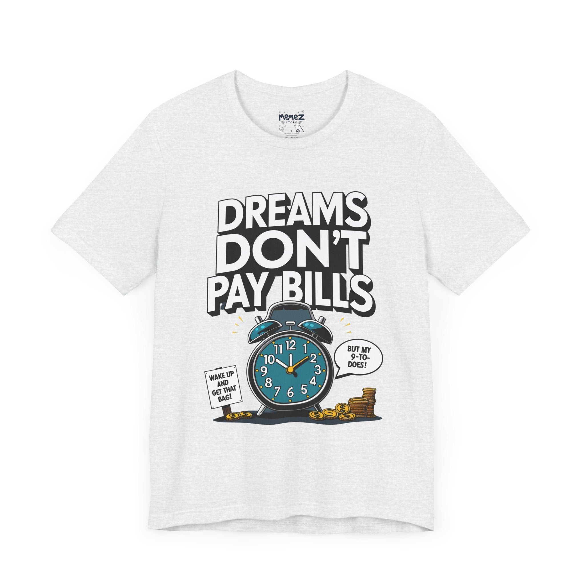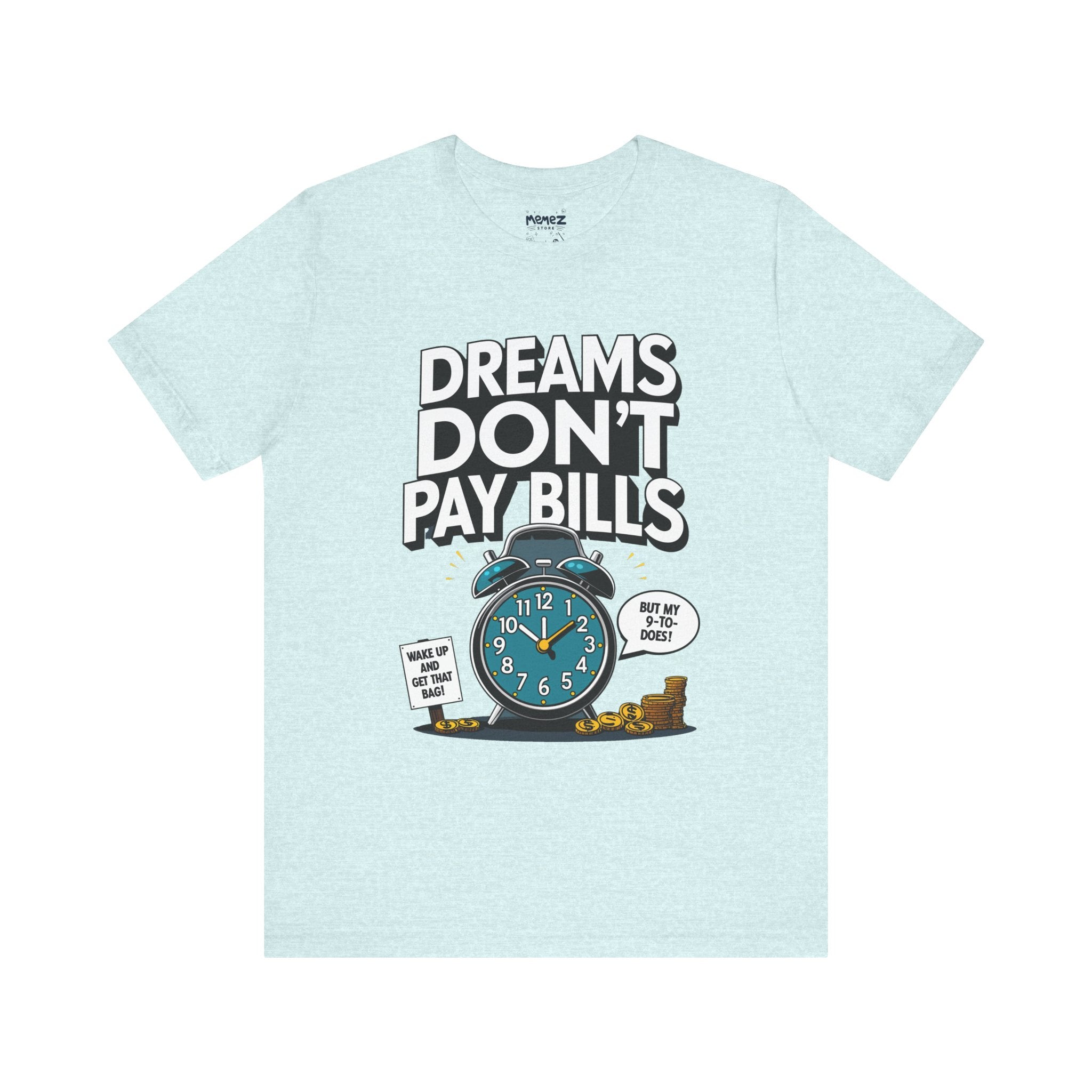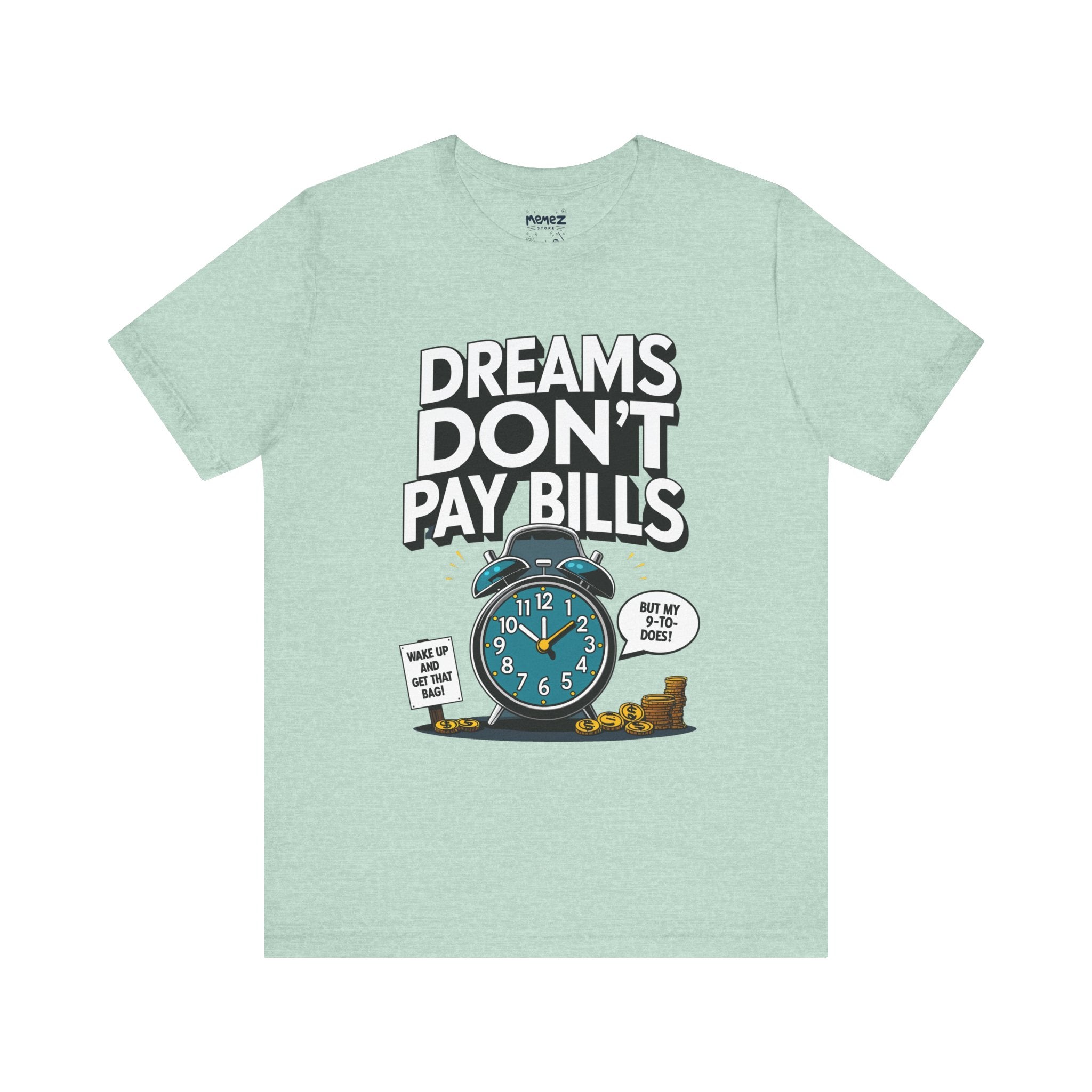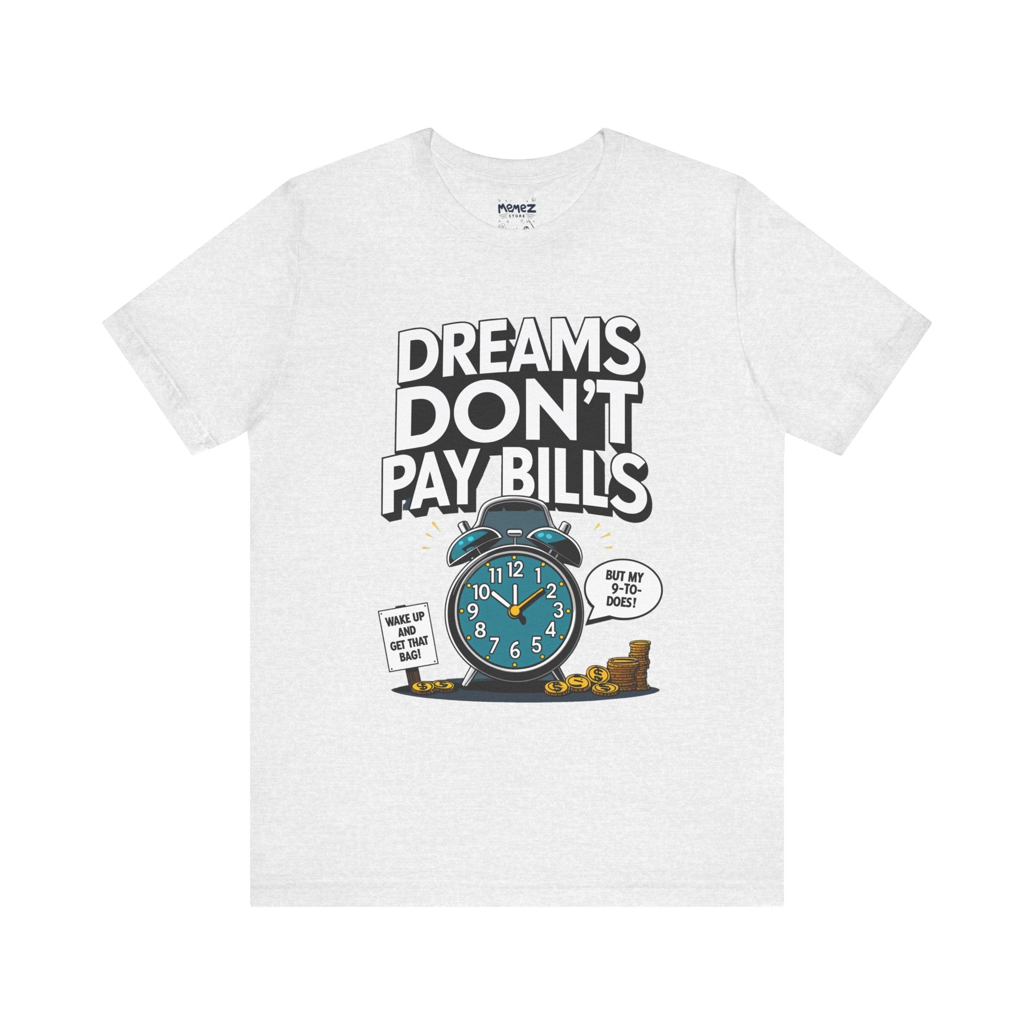 Dreams Dont Pay Bills a Funny and Memez tee by Memez Store. This T-Shirt exudes a casual and humorous vibe, perfect for those who love meme culture and want to make a statement. Ideal for everyday wear or as a conversation starter at social gatherings. Relevant for holidays like April Fools' Day or casual Fridays at work.