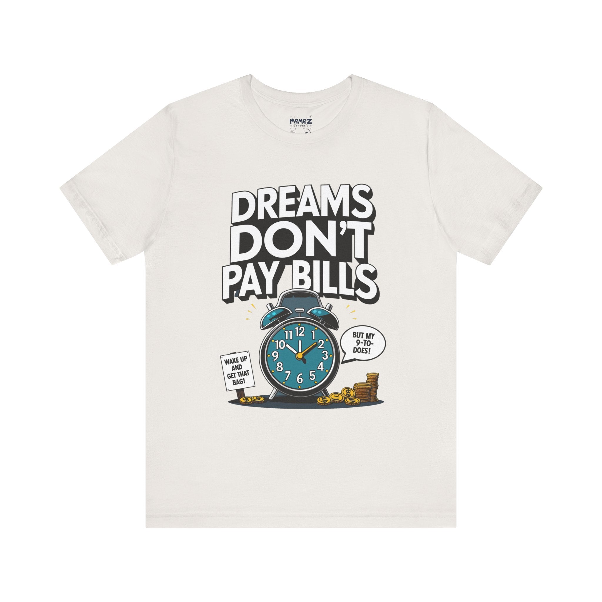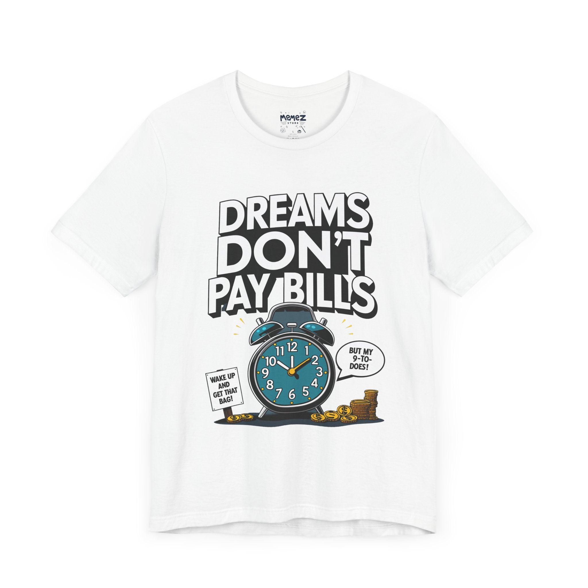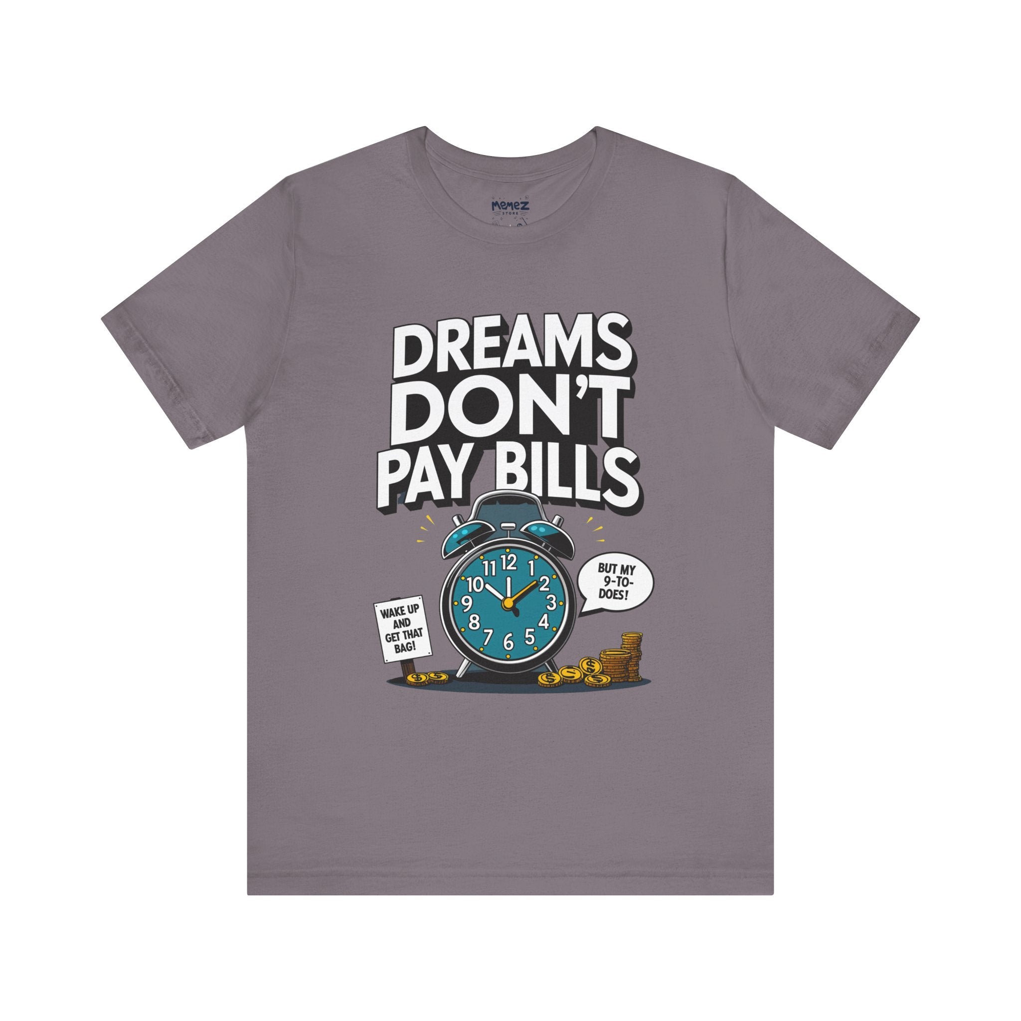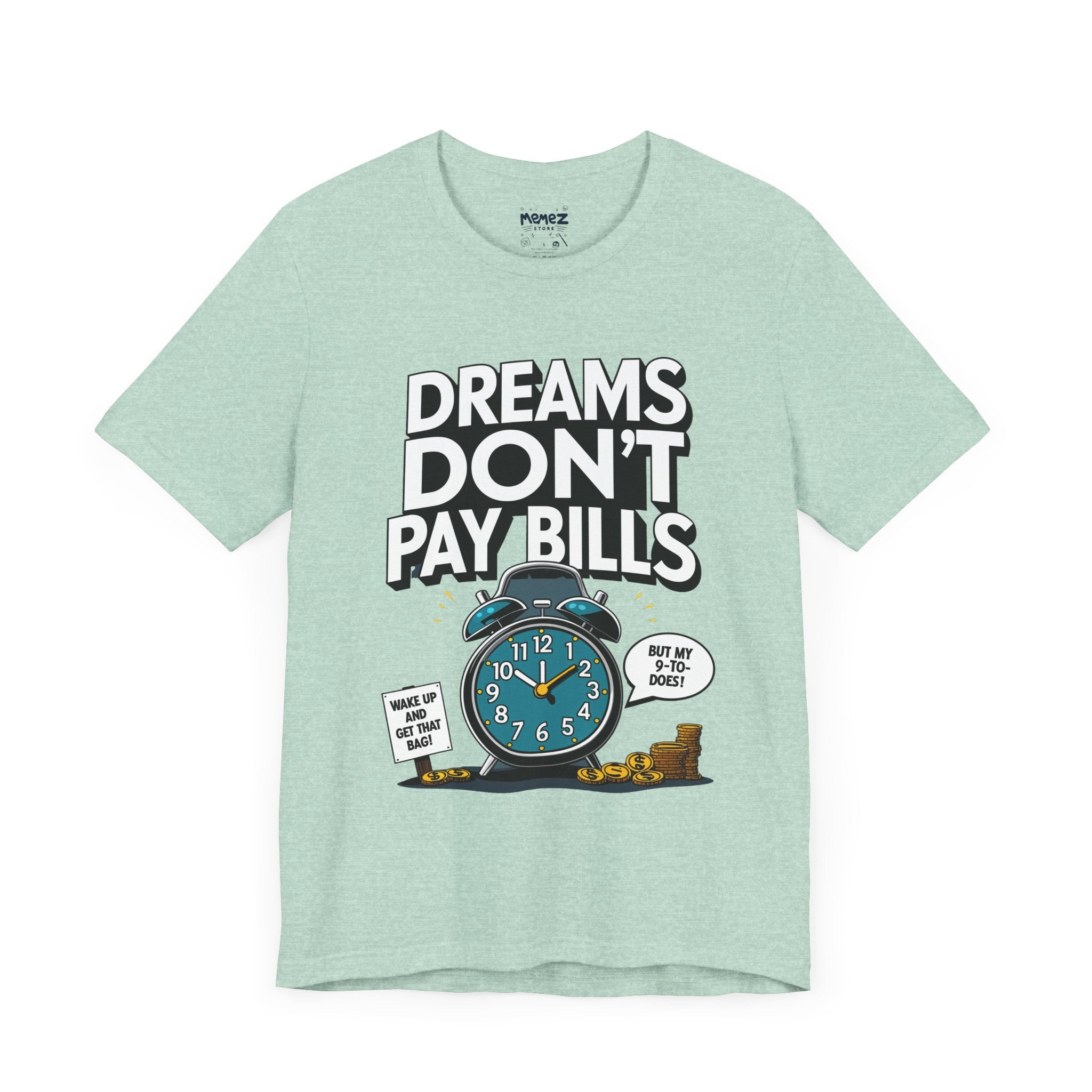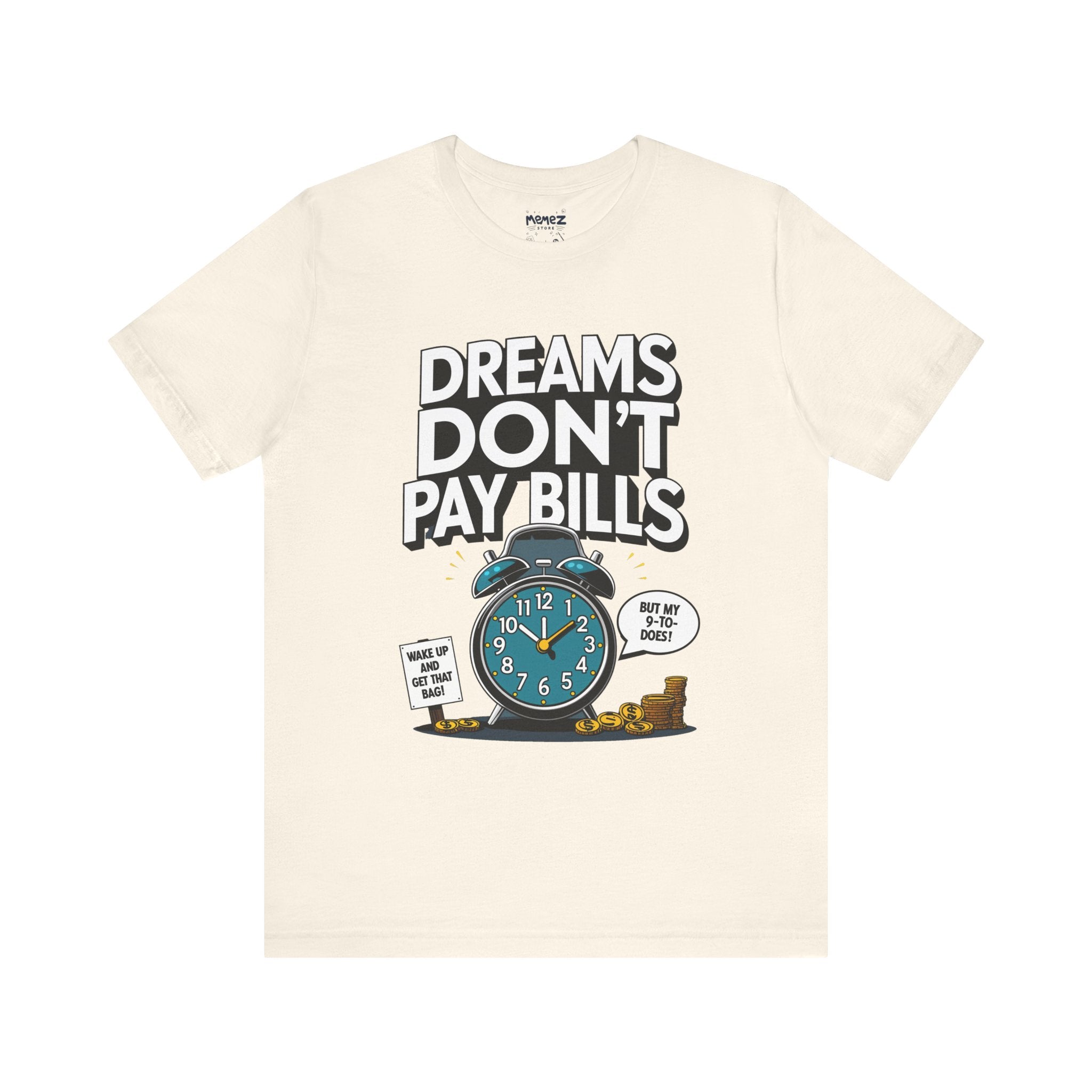 Dreams Dont Pay Bills a Funny and Memez tee by Memez Store. This T-Shirt exudes a casual and humorous vibe, perfect for those who love meme culture and want to make a statement. Ideal for everyday wear or as a conversation starter at social gatherings. Relevant for holidays like April Fools' Day or casual Fridays at work.
