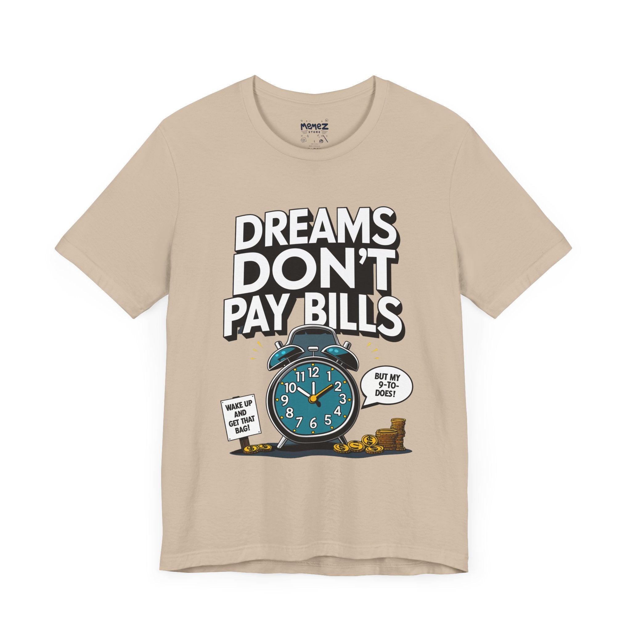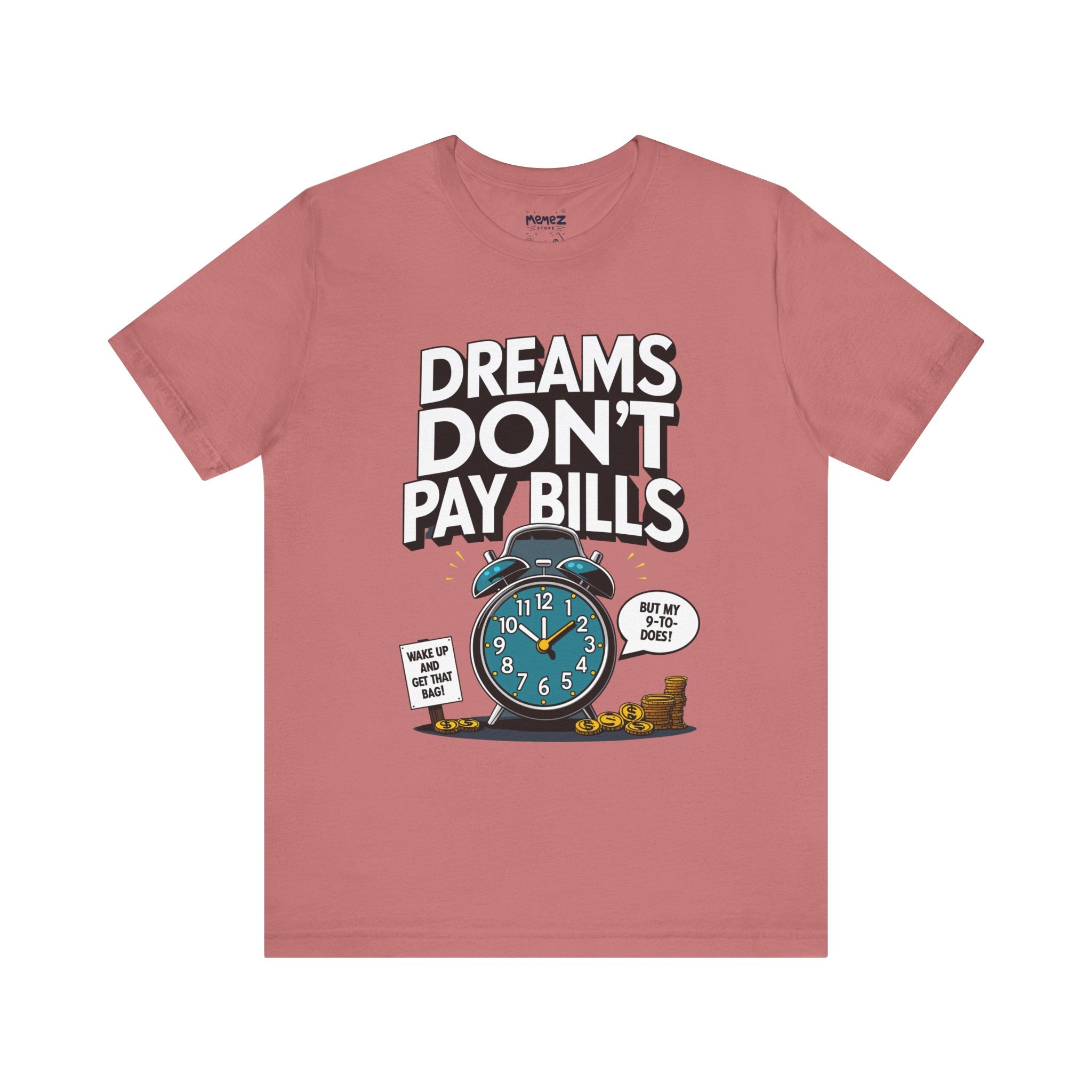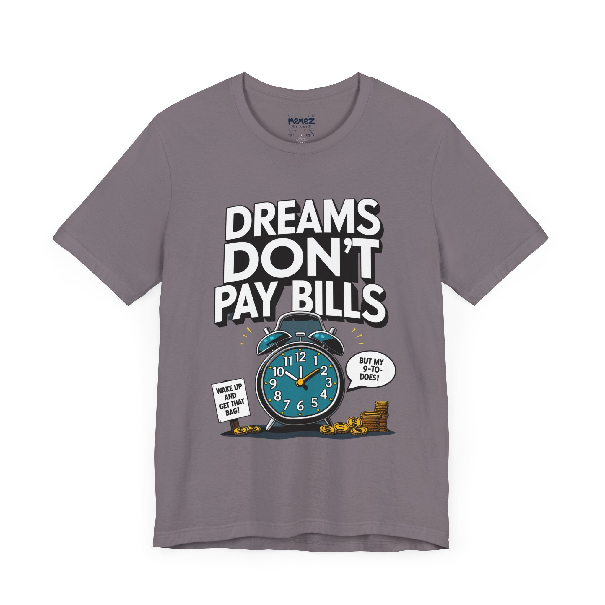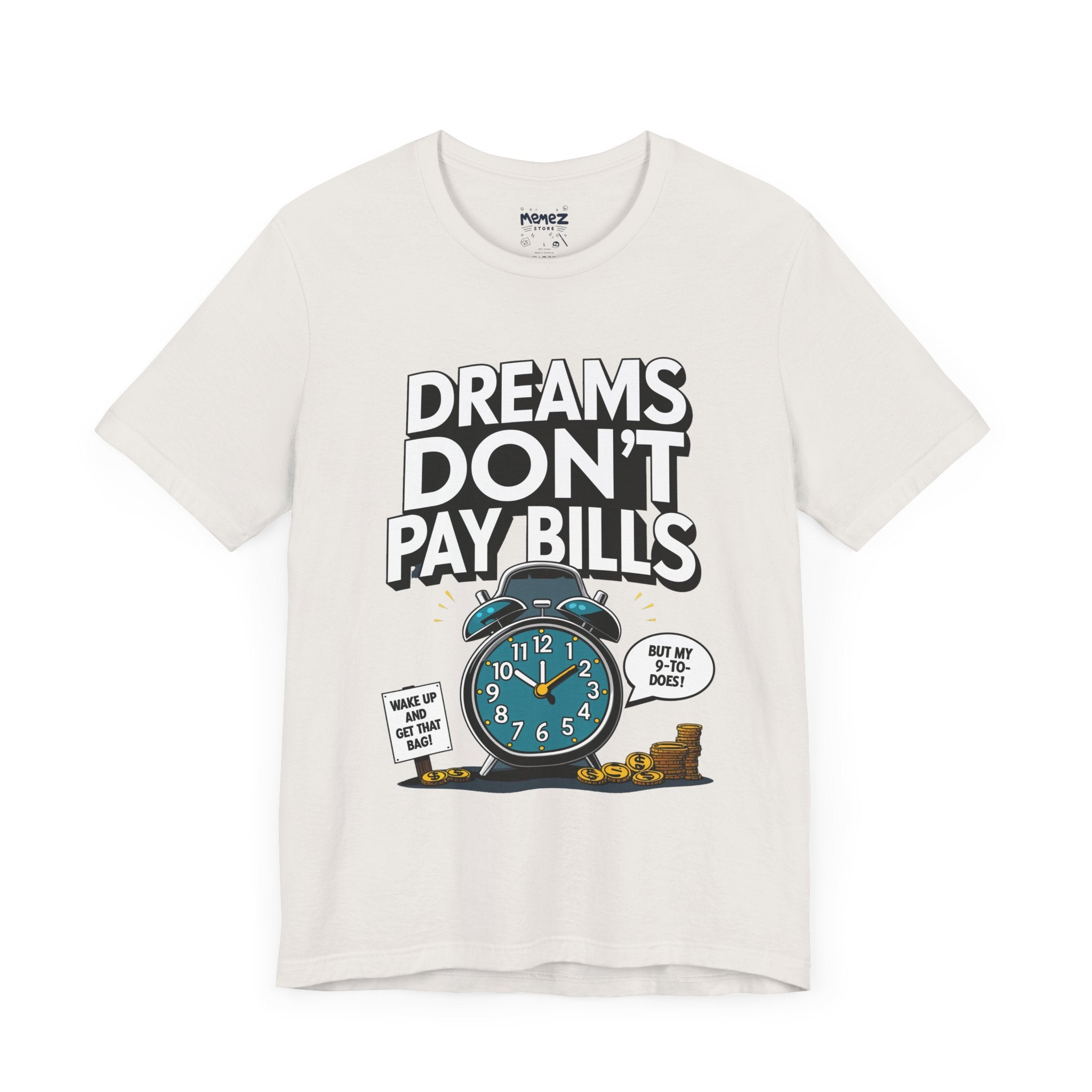 Dreams Dont Pay Bills a Funny and Memez tee by Memez Store. This T-Shirt exudes a casual and humorous vibe, perfect for those who love meme culture and want to make a statement. Ideal for everyday wear or as a conversation starter at social gatherings. Relevant for holidays like April Fools' Day or casual Fridays at work.